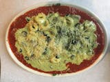 Black olive, artichoke hearts, mushrooms, cheese tortellini, feta cheese, creamy pesto, marinara sauce.