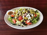 Fresh romaine lettuce, tomatoes, cucumber, green peppers, onions, Greek olive, feta cheese, pepperoncini peppers, and Italian dressing.